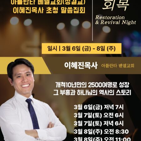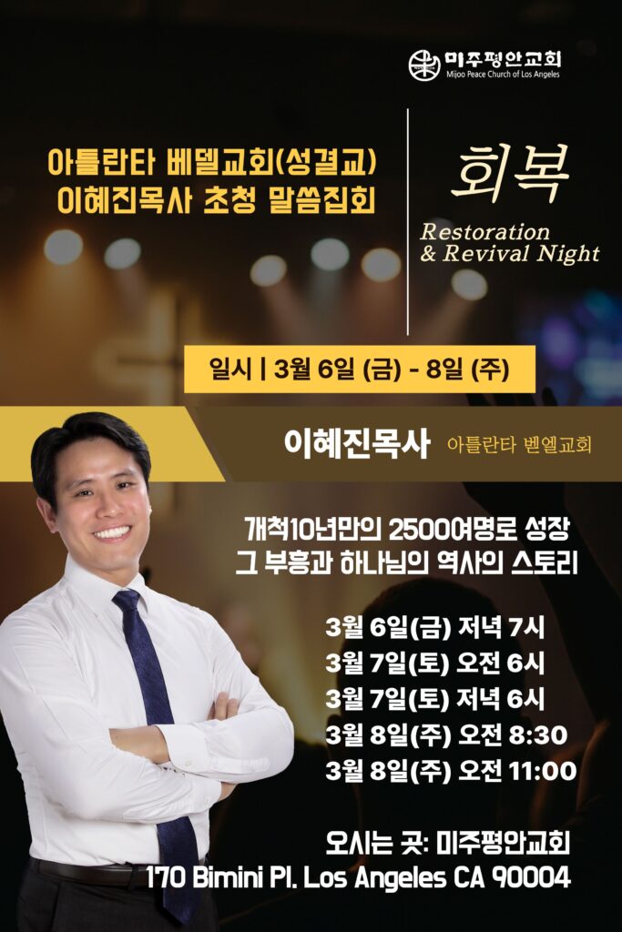 오늘 저녁 7시부터 부흥집회 시작 (3월 7일 금요일) 한국교회와 이민교회가 주목하는 설교자 이혜진 목사 초청 부흥집회 (아틀란테 베델교회, 성결교회) Today pbydream 공지사항 0 Comments http://youtube.com/post/Ugkxz6MuK03g7caAVk3tzOeppR1AY-4MzSTR?si=OnEUXzwZc447ZBlz 오늘 저녁 7시부터 (3월 7일 금요일) 한국교회와 이민교회가 주목하는 설교자 이혜진 목사님(아틀란타 베델교회, 성결교회)을 모시고, 미주평안교회 창립 51주년 감사 부흥집회의 시간을 갖습니다. 저녁 7시에 시작되는 은혜의 자리에 여러분을 초대합니다.